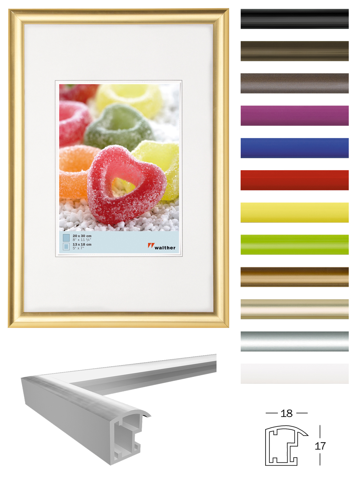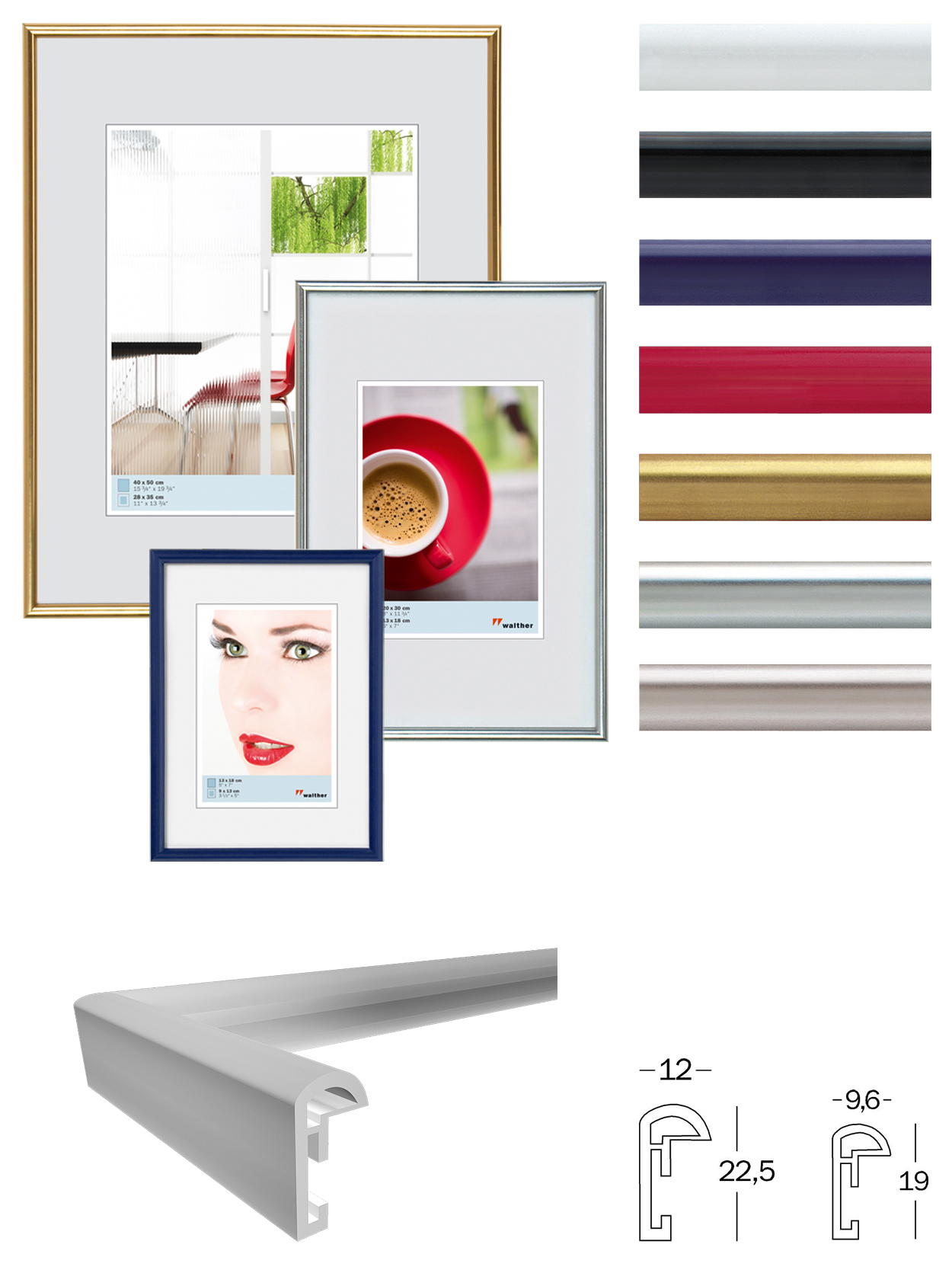 Walther Design Bilderrahmen Chair aus Aluminium - 10mm breites Blockprofil - in Schwarz, Silber, Stahl und Gold. Mit Aufsteller.